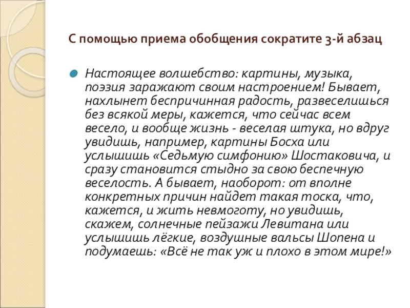 Слайд 12С помощью приема обобщения сократите 3-й абзац