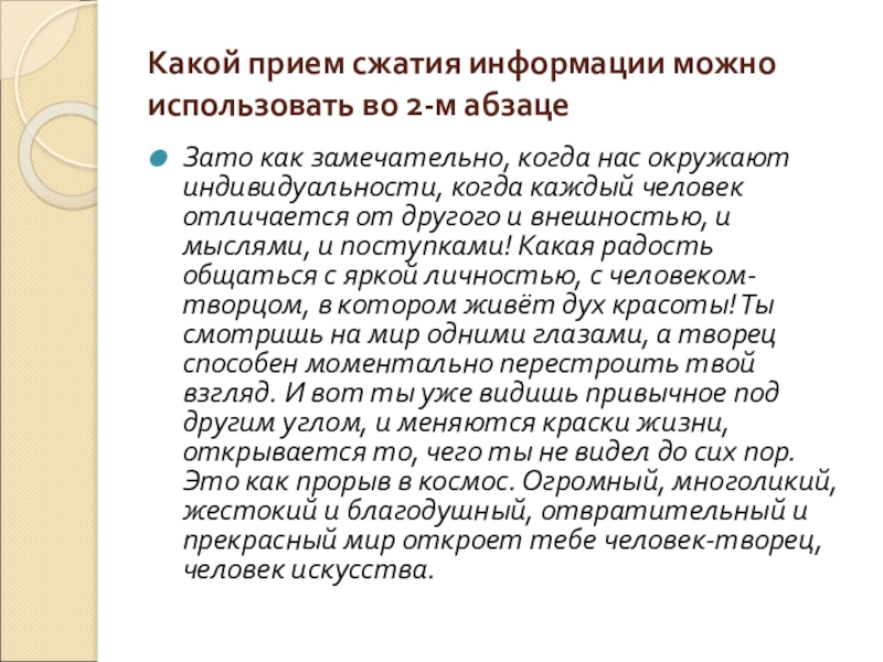 Слайд 10Какой прием сжатия информации можно использовать во 2-м абзаце