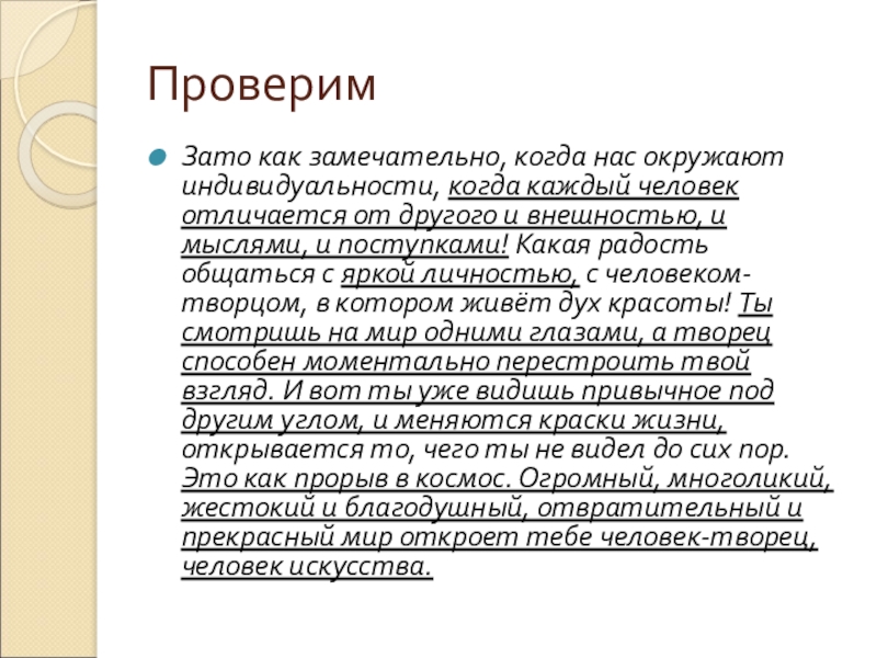 отличается от другого и внешностью, и мыслями, и поступками! Какая радость общаться с яркой личностью, с человеком-творцом, в котором живёт дух красоты! Ты смотришь на мир одними глазами, а творец способен моментально перестроить твой взгляд. И вот ты уже видишь привычное под другим углом, и меняются краски жизни, открывается то, чего ты не видел до сих пор. Это как прорыв в космос. Огромный, многоликий, жестокий и благодушный, отвратительный и прекрасный мир откроет тебе человек-творец, человек искусства.