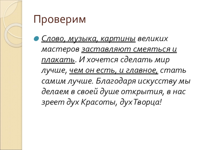 картины великих мастеров заставляют смеяться и плакать. И хочется сделать мир лучше, чем он есть, и главное, стать самим лучше. Благодаря искусству мы делаем в своей душе открытия, в нас зреет дух Красоты, дух Творца!