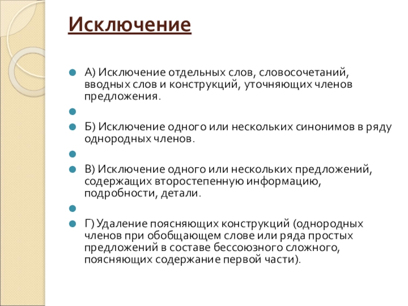 В) Исключение одного или нескольких предложений, содержащих второстепенную информацию, подробности, детали.