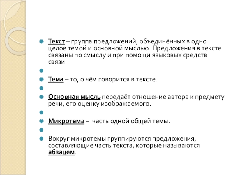 Вокруг микротемы группируются предложения, составляющие часть текста, которые называются абзацем.