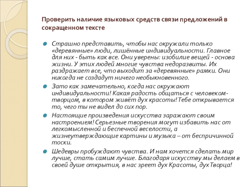 Слайд 21Проверить наличие языковых средств связи предложений в сокращенном тексте