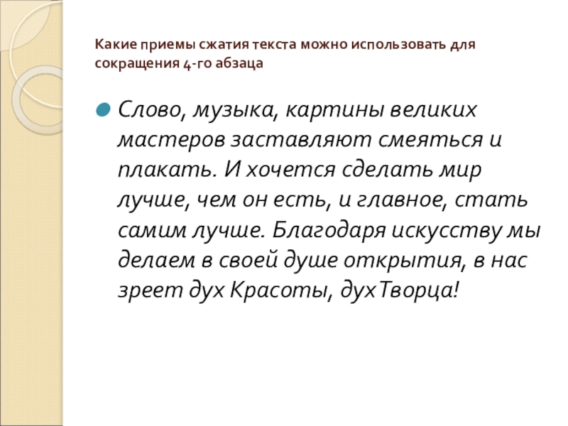 Слайд 15Какие приемы сжатия текста можно использовать для сокращения 4-го абзаца