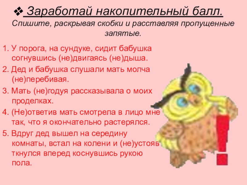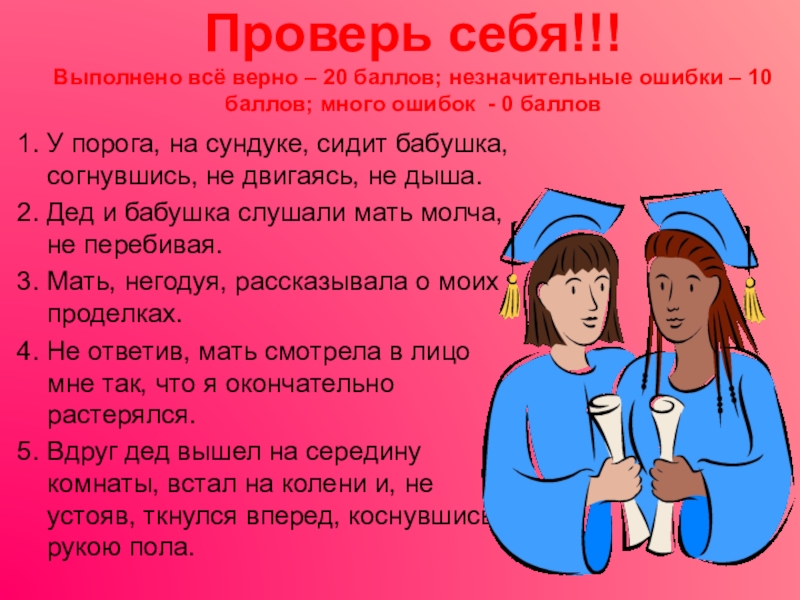 1. У порога, на сундуке, сидит бабушка, согнувшись, не двигаясь, не дыша.