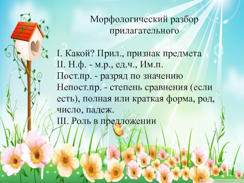 Презентация, доклад по русскому языку на тему Морфологический разбор имени прилагательного