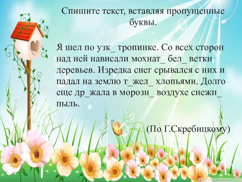 Слайд 5Спишите текст, вставляя пропущенные буквы.