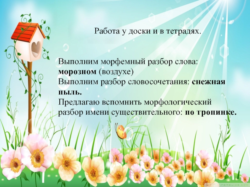 Работа у доски и в тетрадях. Выполним морфемный разбор слова:  морозном (воздухе)Выполним разбор словосочетания: снежная пыль.Предлагаю
