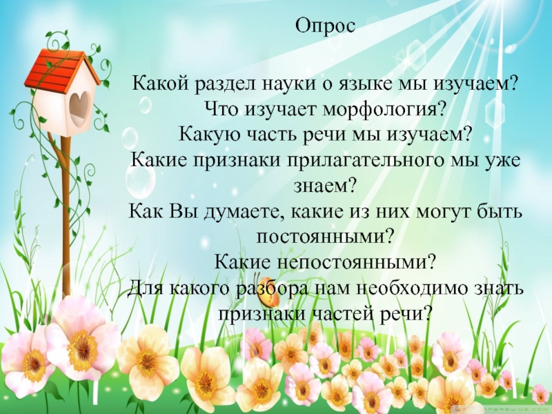 ОпросКакой раздел науки о языке мы изучаем? Что изучает морфология?Какую часть речи мы изучаем?Какие признаки прилагательного мы