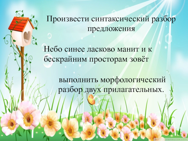 Произвести синтаксический разбор предложения Небо синее ласково манит и к бескрайним просторам зовёт выполнить морфологический разбор двух