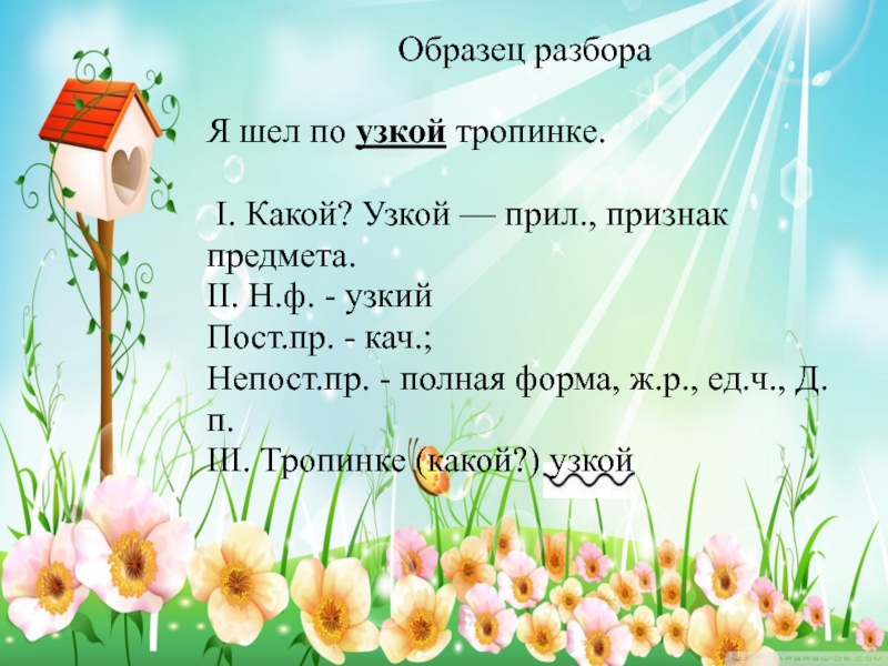 Образец разбораЯ шел по узкой тропинке. I. Какой? Узкой — прил., признак предмета. II. Н.ф. - узкийПост.пр.