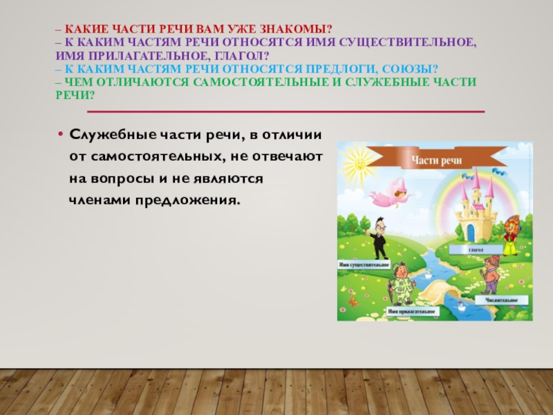 Служебные части речи, в отличии от самостоятельных, не отвечают на вопросы и не являются членами предложения.