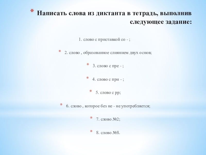Слайд 11Написать слова из диктанта в тетрадь, выполнив следующее задание: