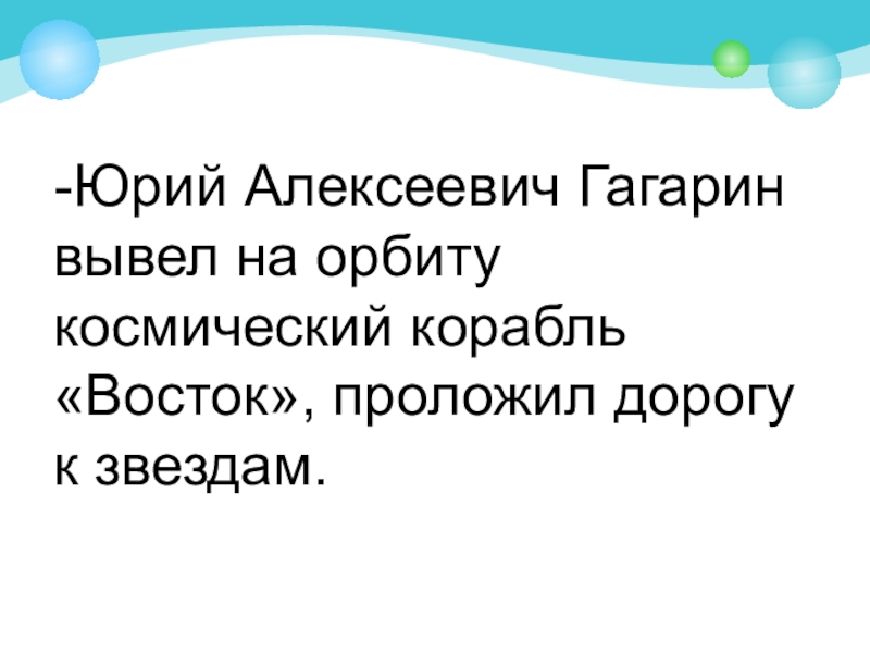 -Юрий Алексеевич Гагарин вывел на орбиту космический корабль «Восток», проложил дорогу к звездам.