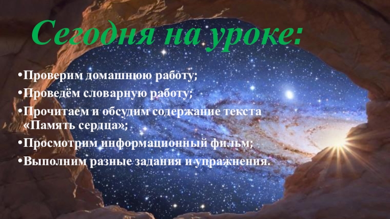 Сегодня на уроке:Проверим домашнюю работу;Проведём словарную работу;Прочитаем и обсудим содержание текста «Память сердца»;Просмотрим информационный фильм;Выполним разные задания и упражнения.