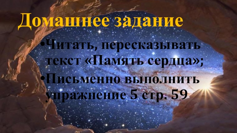 Домашнее заданиеЧитать, пересказывать текст «Память сердца»;Письменно выполнить упражнение 5 стр. 59