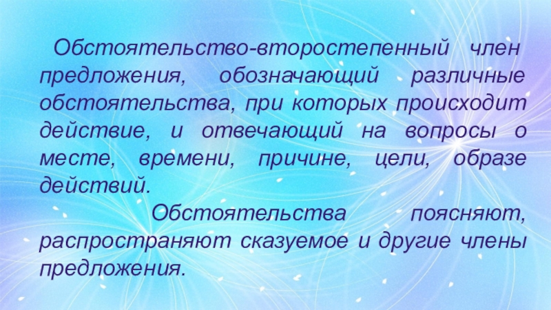 Обстоятельство-второстепенный член предложения, обозначающий различные обстоятельства, при которых происходит действие, и отвечающий на вопросы о месте, времени, причине, цели, образе действий.