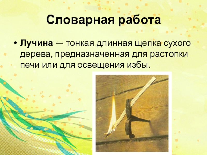 Словарная работаЛучина — тонкая длинная щепка сухого дерева, предназначенная для растопки печи или для освещения избы.