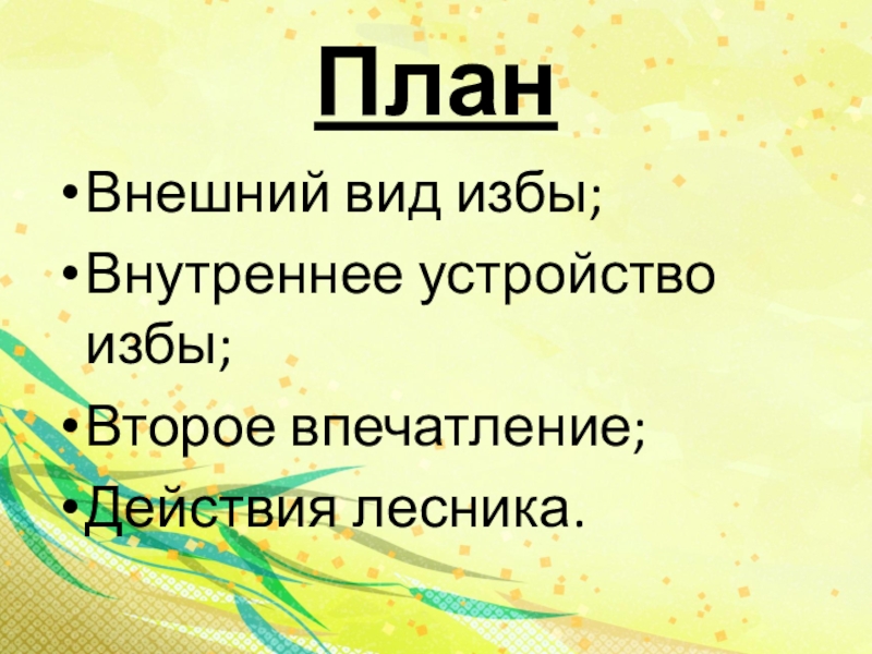 ПланВнешний вид избы;Внутреннее устройство избы;Второе впечатление;Действия лесника.
