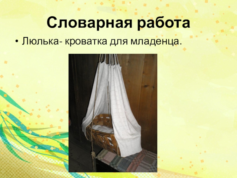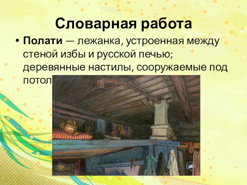 Словарная работаПолати — лежанка, устроенная между стеной избы и русской печью; деревянные настилы, сооружаемые под потолком.