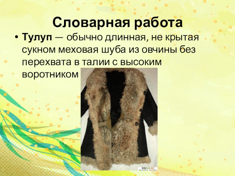 Словарная работаТулуп — обычно длинная, не крытая сукном меховая шуба из овчины без перехвата в талии с высоким