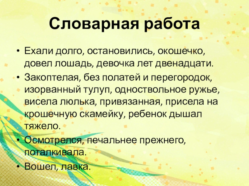 Словарная работаЕхали долго, остановились, окошечко, довел лошадь, девочка лет двенадцати.Закоптелая, без полатей и перегородок, изорванный тулуп, одноствольное