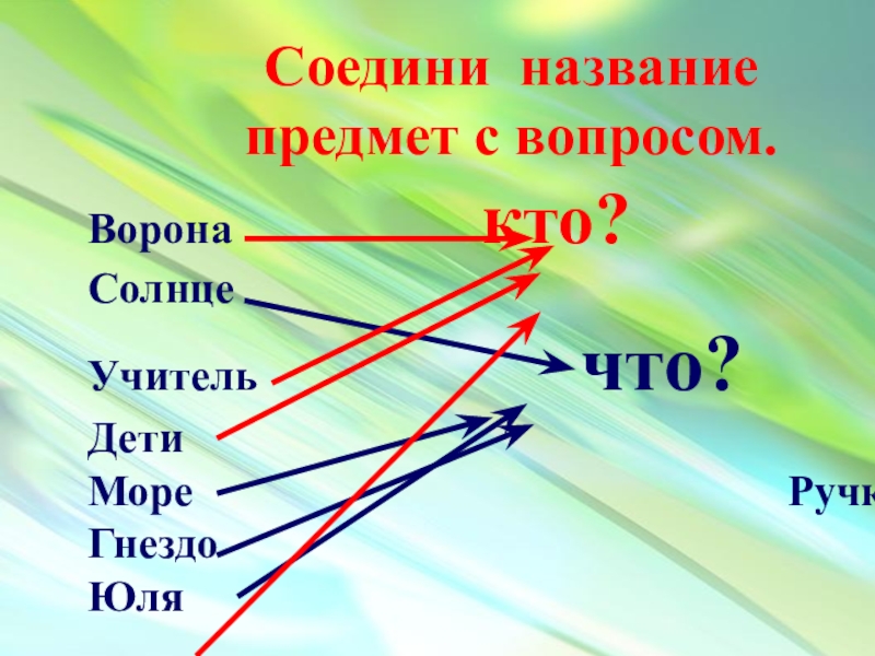 Соедини название предмет с вопросом.Ворона   		      кто?