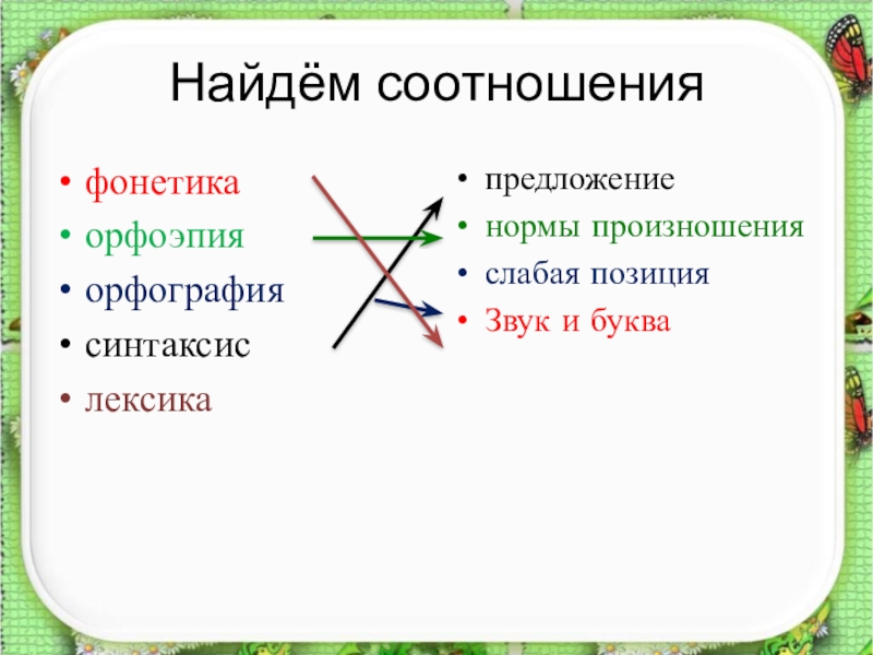 Найдём соотношенияфонетикаорфоэпияорфографиясинтаксислексикапредложениенормы произношенияслабая позицияЗвук и буква