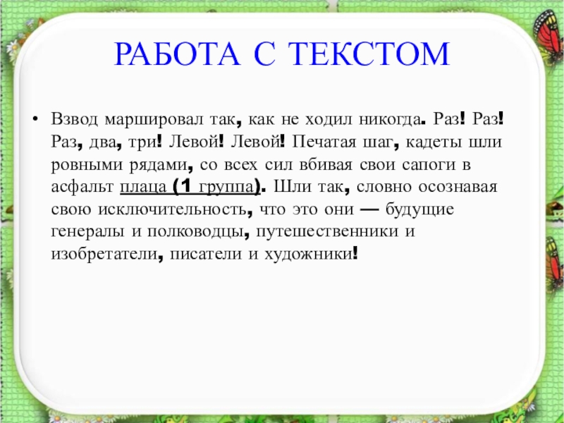 РАБОТА С ТЕКСТОМВзвод маршировал так, как не ходил никогда. Раз! Раз! Раз, два, три! Левой! Левой! Печатая