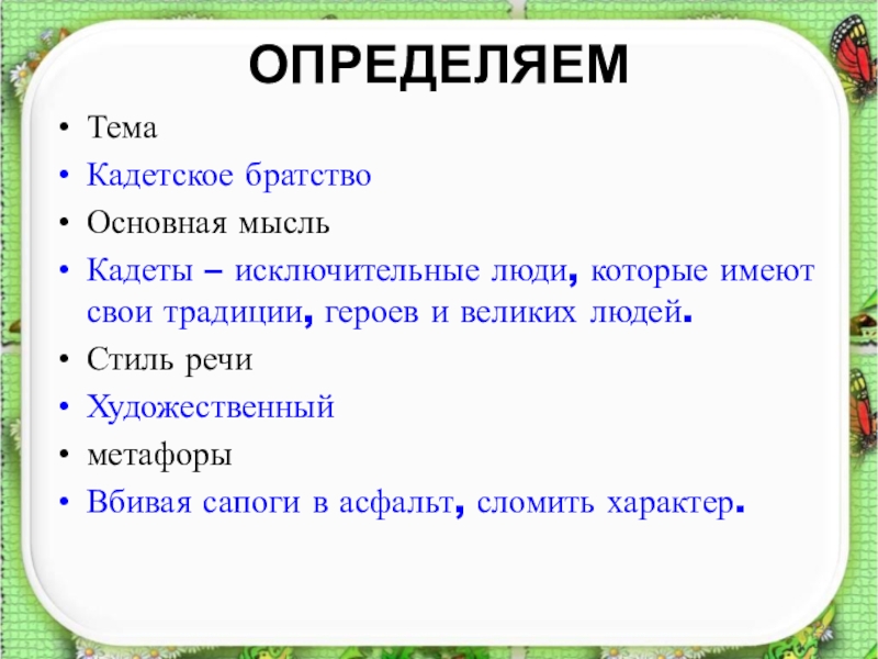 ОПРЕДЕЛЯЕМТемаКадетское братствоОсновная мысльКадеты – исключительные люди, которые имеют свои традиции, героев и великих людей.Стиль речиХудожественныйметафорыВбивая сапоги в