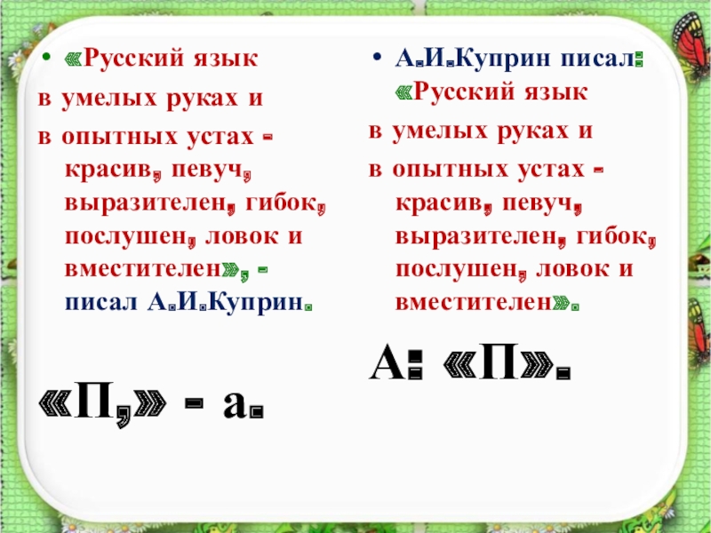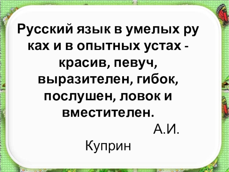 «Русский язык в умелых руках и в опытных устах -красив, певуч, выразителен, гибок, послушен, ловок и вместителен», - писал А.И.Куприн.«П,» - а.А.И.Куприн писал: «Русский язык в умелых руках и в опытных устах -красив, певуч, выразителен, гибок, послушен, ловок и