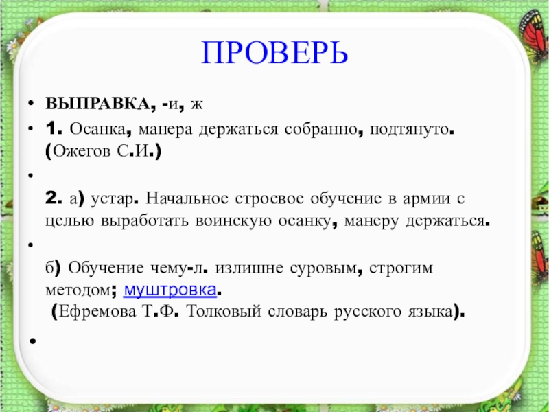 ПРОВЕРЬВЫПРАВКА, -и, ж1. Осанка, манера держаться собранно, подтянуто. (Ожегов С.И.) 2. а) устар. Начальное строевое обучение в