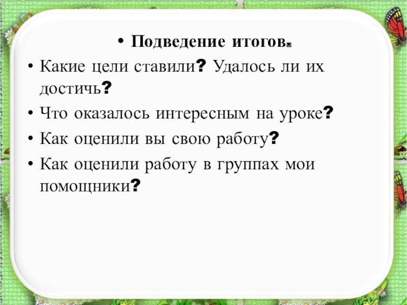 Подведение итогов.Какие цели ставили? Удалось ли их достичь?Что оказалось интересным на уроке?Как оценили вы свою работу? Как