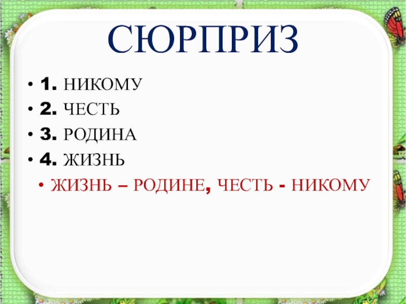 СЮРПРИЗ1. НИКОМУ2. ЧЕСТЬ3. РОДИНА4. ЖИЗНЬЖИЗНЬ – РОДИНЕ, ЧЕСТЬ - НИКОМУ