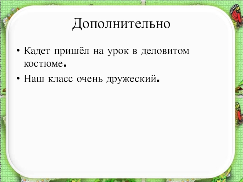ДополнительноКадет пришёл на урок в деловитом костюме.Наш класс очень дружеский.