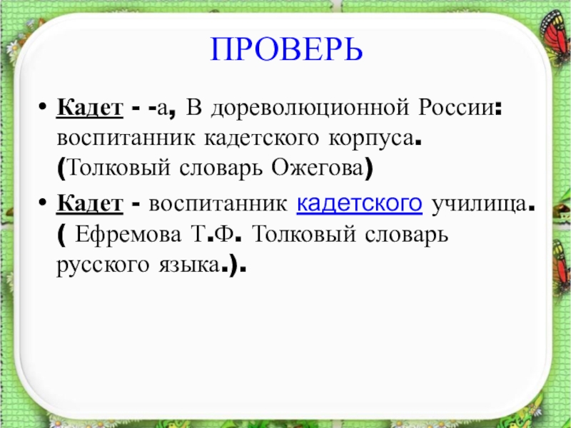 ПРОВЕРЬКадет - -а, В дореволюционной России: воспитанник кадетского корпуса. (Толковый словарь Ожегова)Кадет - воспитанник кадетского училища. ( Ефремова Т.Ф.