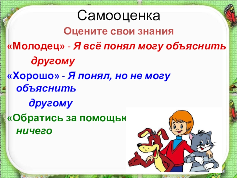 Самооценка Оцените свои знания «Молодец» - Я всё понял могу объяснить
