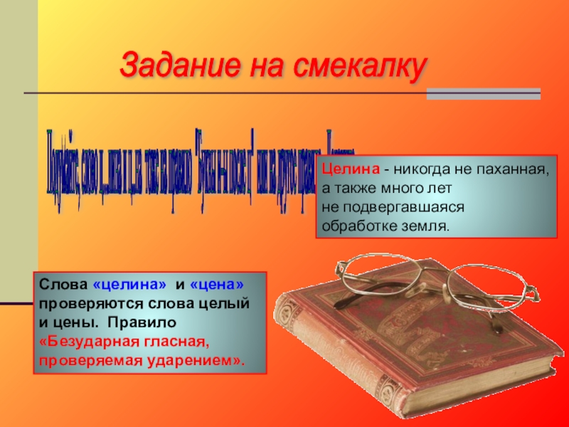 Слова «целина» и «цена» проверяются слова целый и цены. Правило «Безударная гласная, проверяемая ударением».