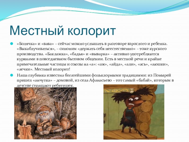 и ребенка. «Выкаблучиваться», – синоним «держать себя неестественно» – тоже курского производства. «Баклажка», «бадья» и «выварка» – активно употребляются курянами в повседневном бытовом общении. Есть в местной речи и крайне примечательные частицы и союзы на «а»: «аж», «айда», «али», «ась», «аюшки», «аечки». Местный колорит!
