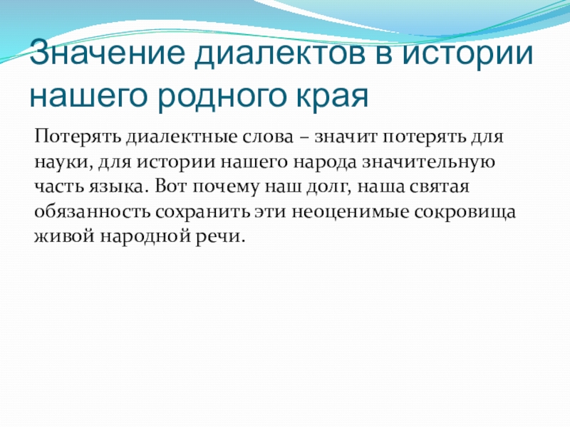 Значение диалектов в истории нашего родного краяПотерять диалектные слова – значит потерять для науки, для истории нашего