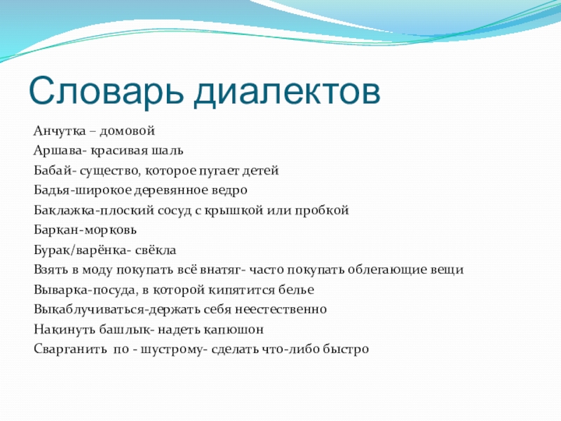 Словарь диалектовАнчутка – домовойАршава- красивая шальБабай- существо, которое пугает детейБадья-широкое деревянное ведроБаклажка-плоский сосуд с крышкой или пробкойБаркан-морковьБурак/варёнка-