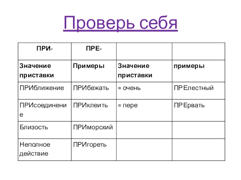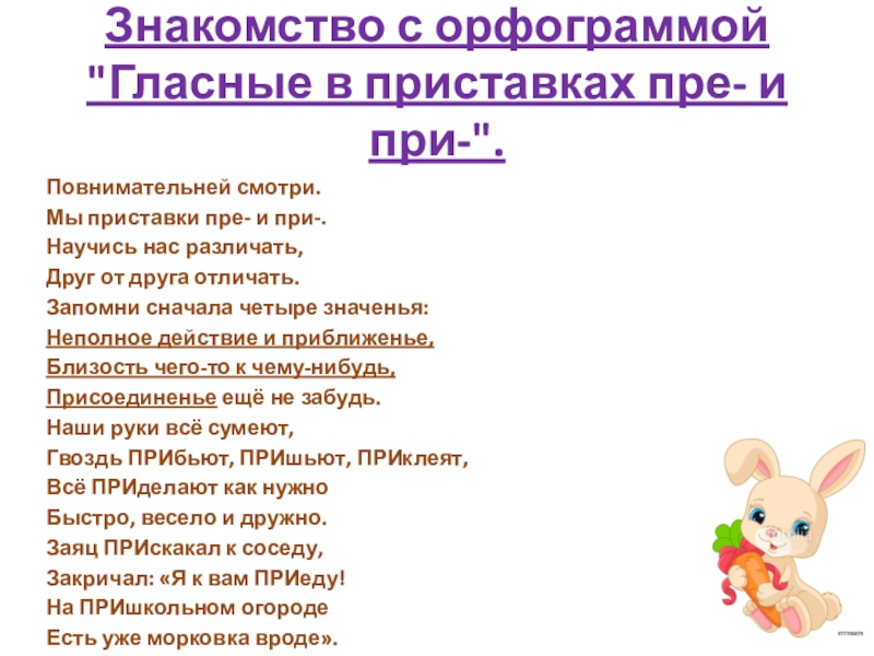 пре- и при-.  Научись нас различать,  Друг от друга отличать.  Запомни сначала четыре значенья:  Неполное действие и приближенье,  Близость чего-то к чему-нибудь,  Присоединенье ещё не забудь.  Наши руки всё сумеют,  Гвоздь ПРИбьют, ПРИшьют, ПРИклеят,  Всё ПРИделают как нужно  Быстро, весело и дружно.  Заяц ПРИскакал к соседу,  Закричал: «Я к вам ПРИеду!  На ПРИшкольном огороде  Есть уже морковка вроде».  ПРИоткрой скорей окошко –  В дом попасть не может кошка.  Ах, котлеты ПРИгорели!  Не беда, уже их съели.  ПРЕ – отличная приставка.  Ей во всём нужна добавка.  Словом «ОЧЕНЬ» проверяем  Или ПЕРЕ- заменяем.