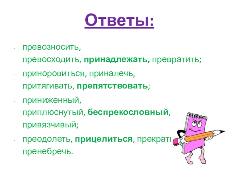 Ответы: превозносить, превосходить, принадлежать, превратить;приноровиться, приналечь, притягивать, препятствовать;приниженный, приплюснутый, беспрекословный, привязчивый;преодолеть, прицелиться, прекратить, пренебречь.