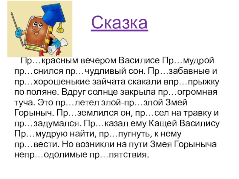Сказка Пр…красным вечером Василисе Пр…мудрой пр…снился пр…чудливый сон. Пр…забавные и пр…хорошенькие зайчата скакали впр…прыжку по поляне. Вдруг солнце закрыла пр…огромная туча. Это пр…летел злой-пр…злой Змей Горыныч. Пр…землился он, пр…сел на травку и пр…задумался. Пр…казал ему