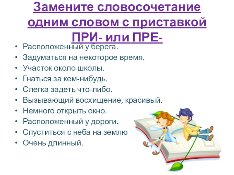Слайд 9Замените словосочетание одним словом с приставкой ПРИ- или ПРЕ-