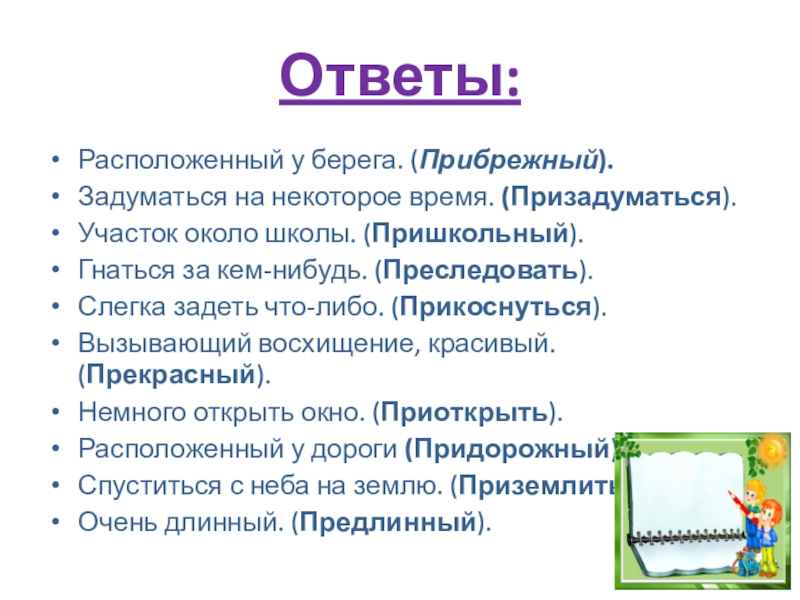 Ответы:Расположенный у берега. (Прибрежный). Задуматься на некоторое время. (Призадуматься). Участок около школы. (Пришкольный).Гнаться за кем-нибудь. (Преследовать).Слегка задеть что-либо. (Прикоснуться). Вызывающий восхищение,
