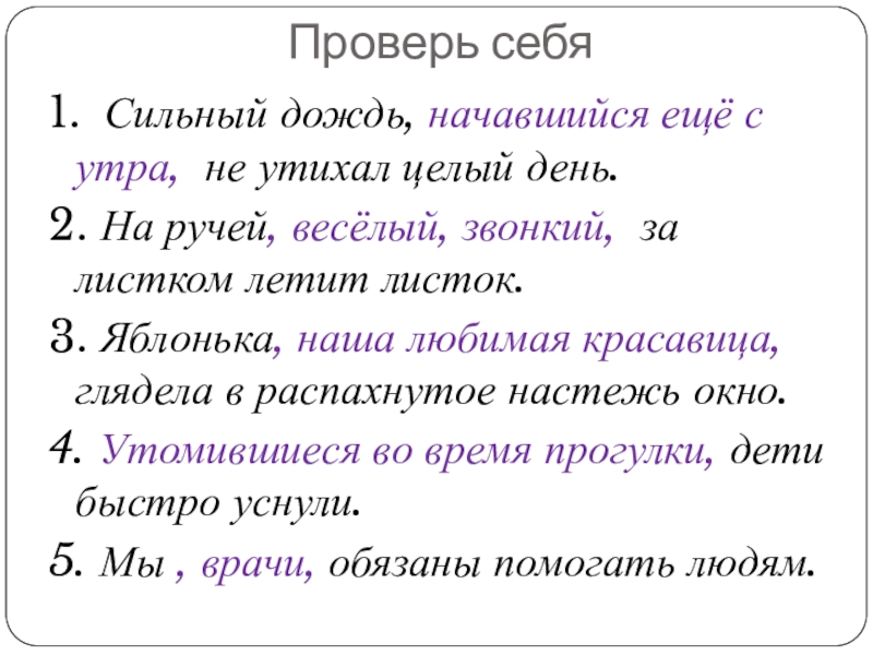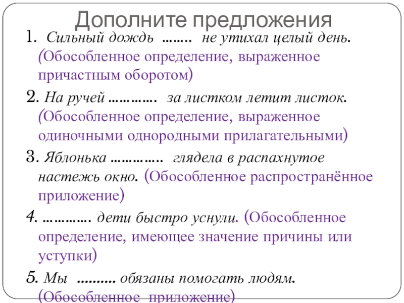 1. Сильный дождь …….. не утихал целый день. (Обособленное определение,