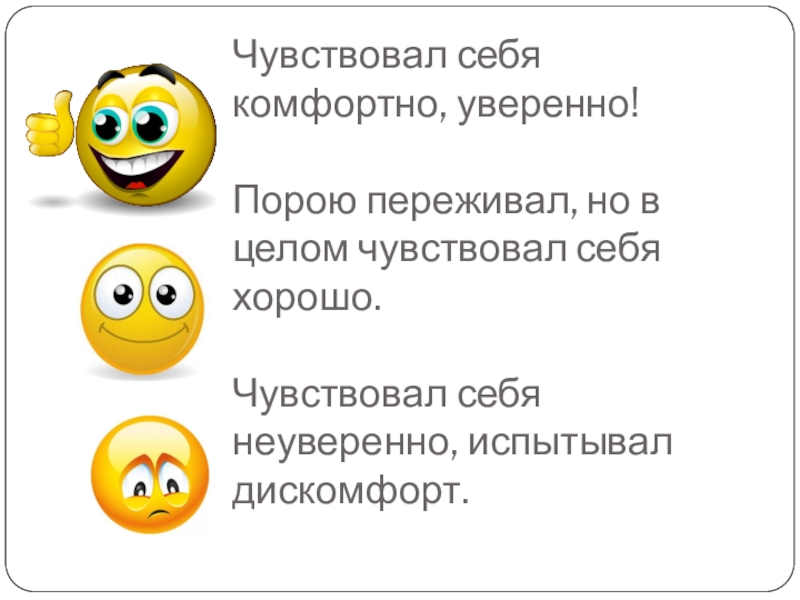 Слайд 13Чувствовал себя комфортно, уверенно!