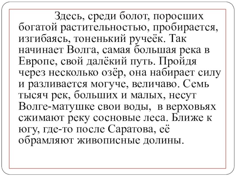 поросших богатой растительностью, пробирается, изгибаясь, тоненький ручеёк. Так начинает Волга, самая большая река в Европе, свой далёкий путь. Пройдя через несколько озёр, она набирает силу и разливается могуче, величаво. Семь тысяч рек, больших и малых, несут Волге-матушке свои воды, в верховьях сжимают реку сосновые леса. Ближе к югу, где-то после Саратова, её обрамляют живописные долины.