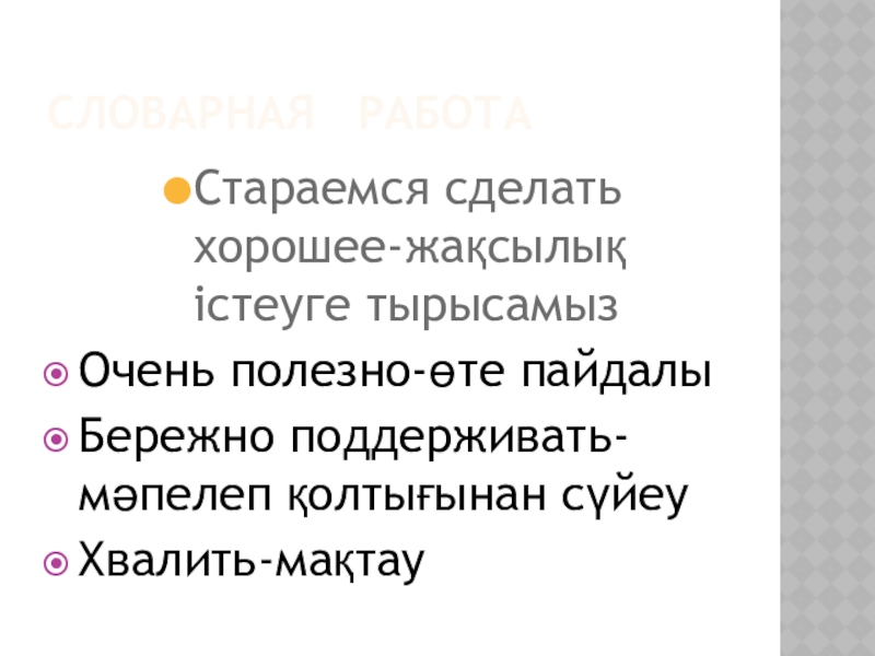 Словарная  работаСтараемся сделать хорошее-жақсылық істеуге тырысамызОчень полезно-өте пайдалыБережно поддерживать-мәпелеп қолтығынан сүйеуХвалить-мақтау